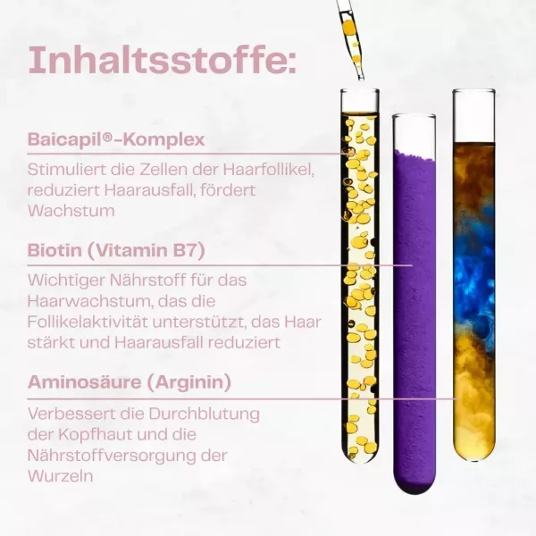 | Biotin (Vitamin B7) – wichtiger Nährstoff für das Haarwachstum, das die Follikelaktivität unterstützt, das Haar stärkt und Haarausfall reduziert. | ![]() |